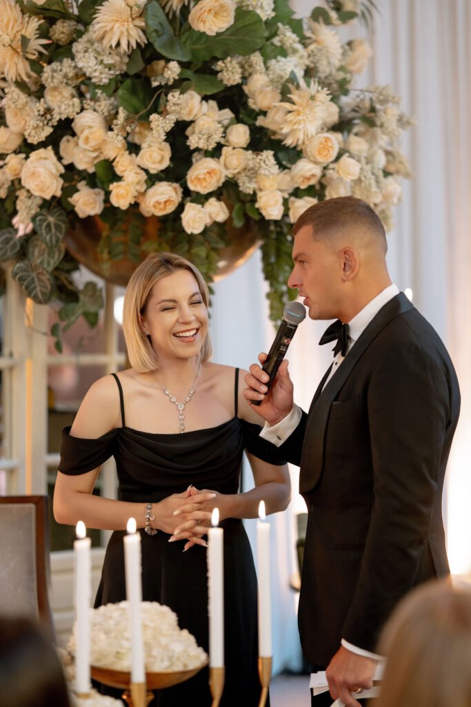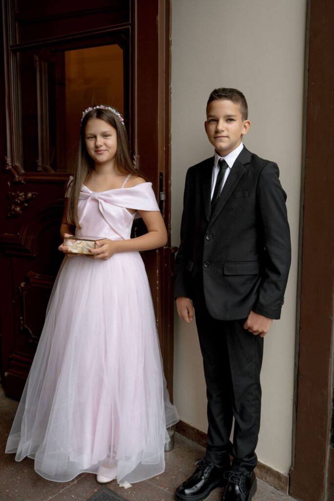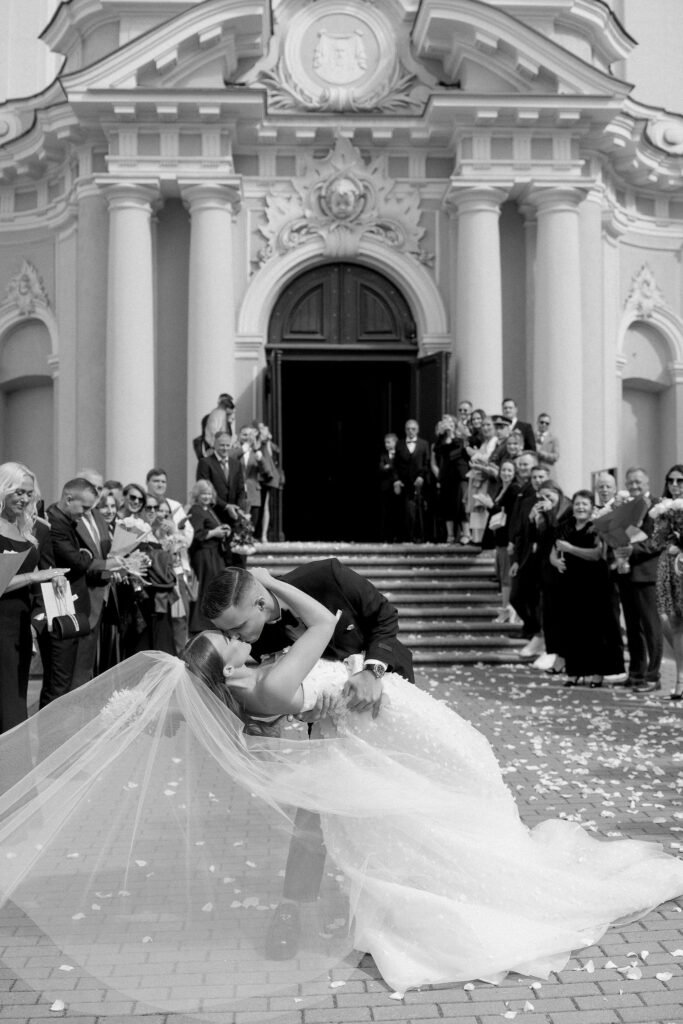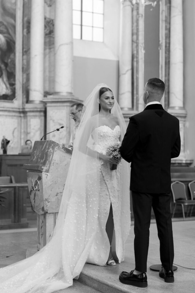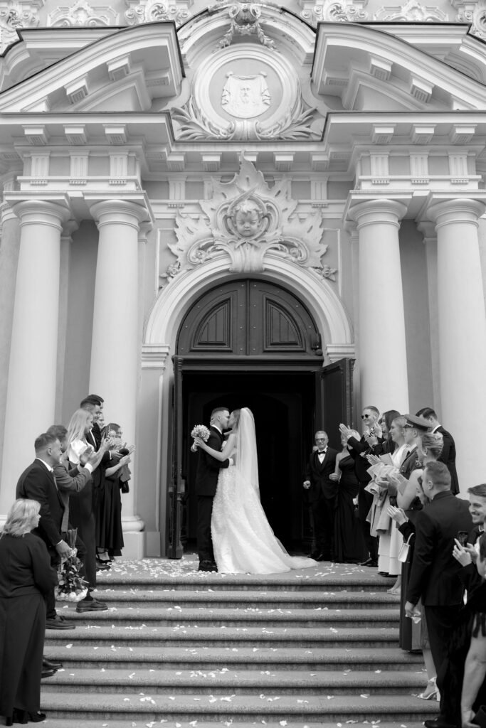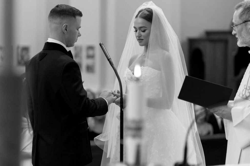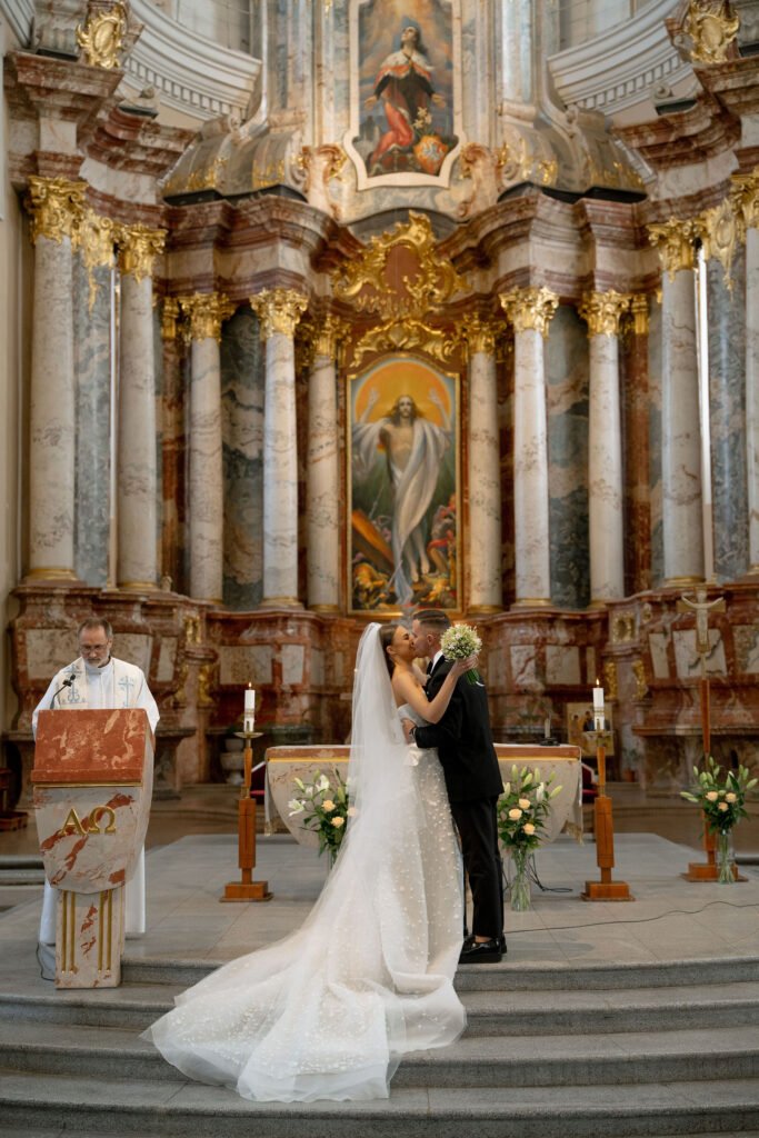 Porą sutuokė Vilniaus Šv. Kazimiero (jezuitų) bažnyčios rektorius Vytautas Sadauskas. Žiedus saugoti buvo patikėta nuotakos sesei Kamilei ir jaunikio broliui Norbertui. Sužadėtiniai visos ceremonijos metu tvirtai laikėsi už rankų.