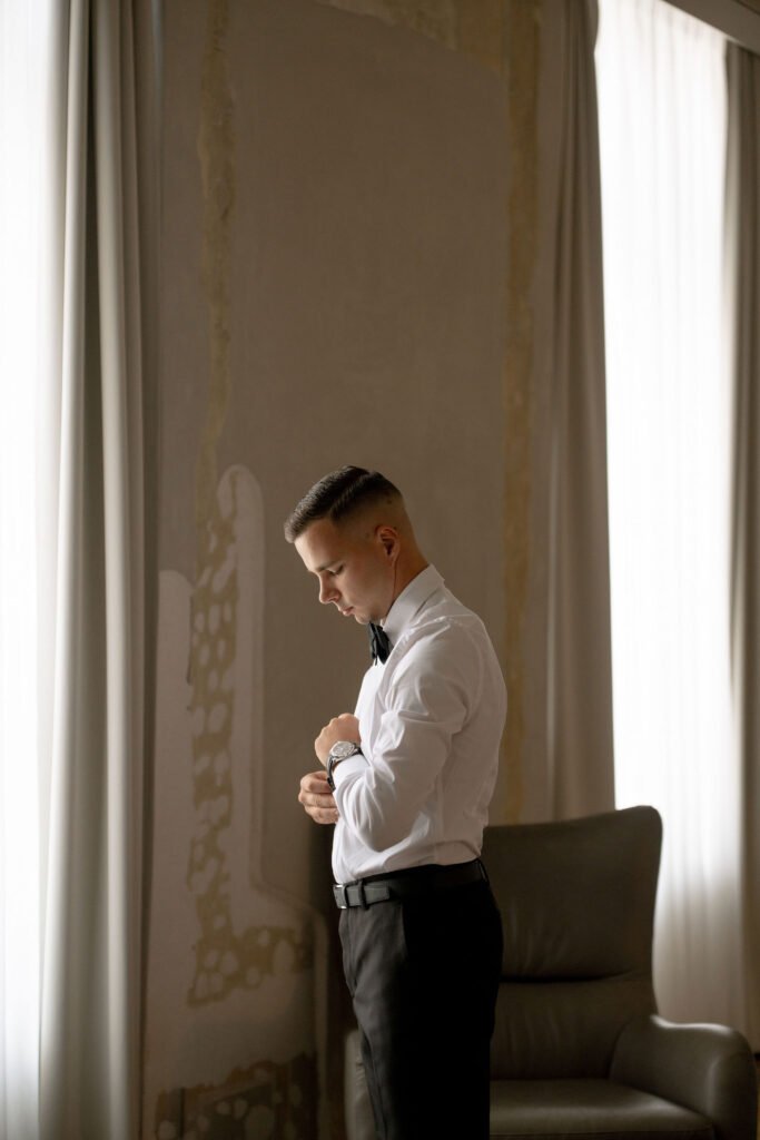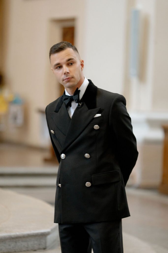 Jaunikiui buvo dar paprasčiau. Jis tiksliai žinojo, kaip nori atrodyti ir kelionės į Italiją metu, užėjus į vieną parduotuvę, jis visai netikėtai įsigijo savo svajonių kostiumą, kurį tik šiek tiek tereikėjo pakoreguoti visai prieš vestuves. Jis nenorėjo standartinio kostiumo, norėjo modernesnės interpretacijos, kažko šiek tiek kitaip.