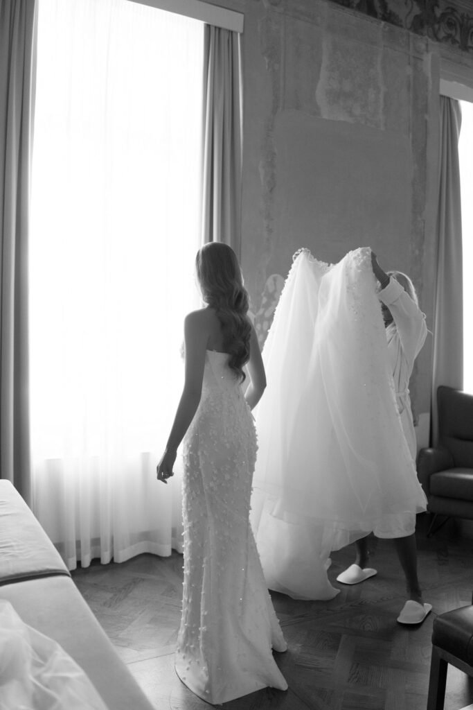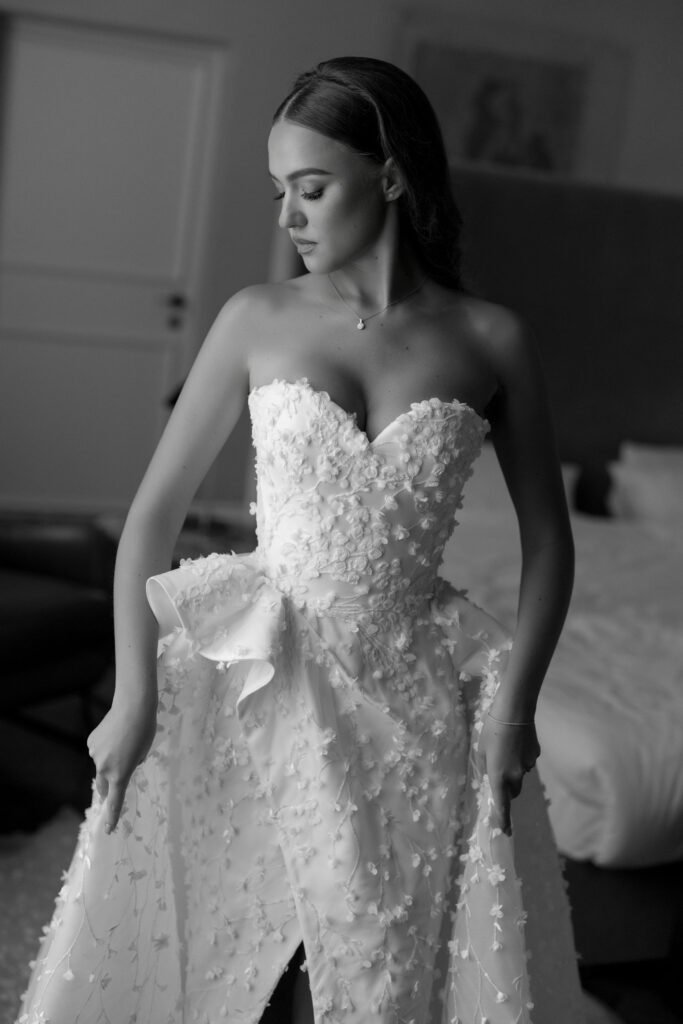Nuotakos pasiruošimas vyko jaunavedžių pamiltam Vilniaus viešbutyje „Hotel Pacai”. Nuotakos makiažu rūpinosi meistrė Gabrielė Šreiberytė, šukuosena – Greta Bokmotaitė, grožio salono „COLLAB.backstage” įkūrėjos.