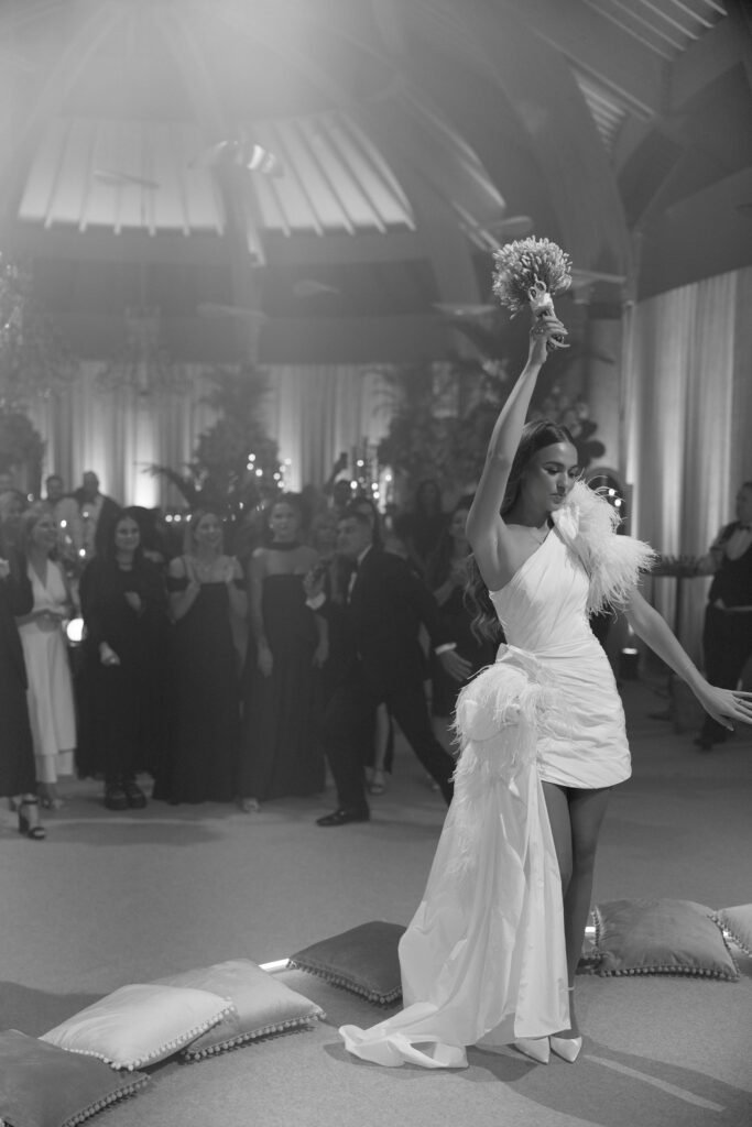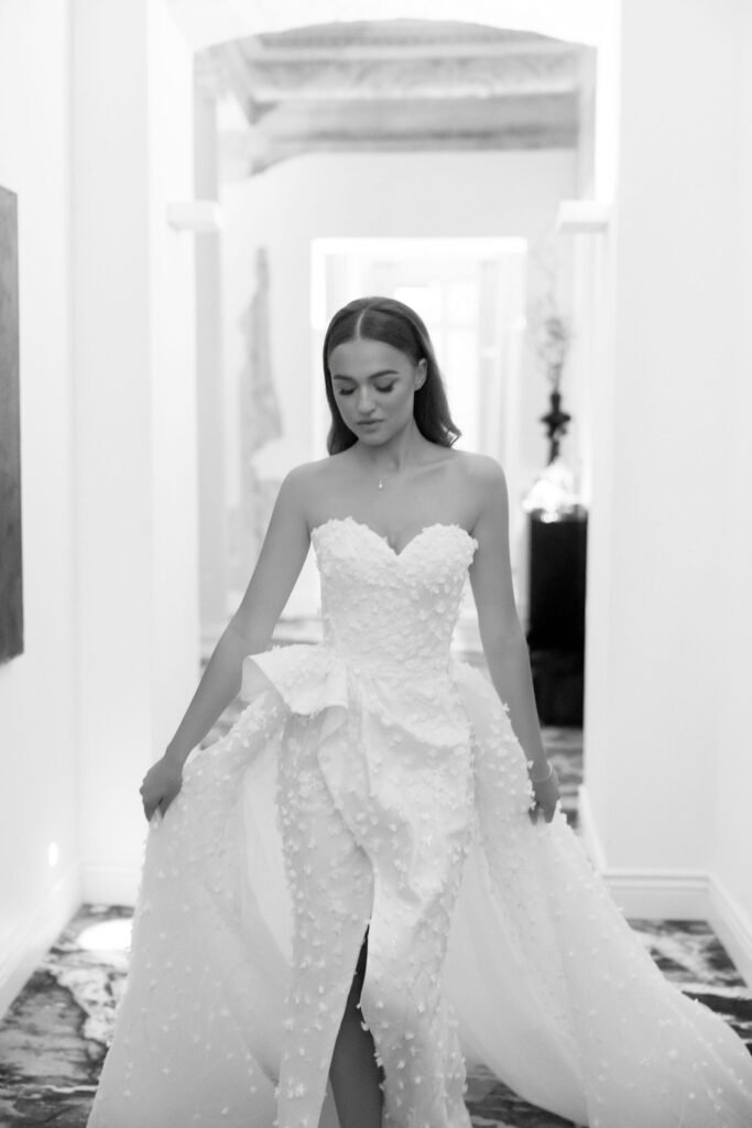Dėl antrojo įvaizdžio kūrėjos abejonių taip pat nebuvo. „Man patinka Monikos „MÁS924“ kūryba, stilius, per kelis vizitus išgryninome detales: plunksnos, trumpa suknelė, bet su žemę liečiančiomis detalėmis, įdomus kirpimas ir audinys. Norėjau suknelės, kuri išskirtų mane iš minios. Juk aš – nuotaka.“